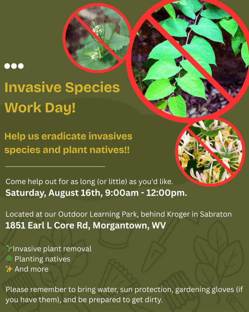 Tuesday, May 7th 2024 @ 6:00 pm – 7:30 pm – Make a splash on Tuesday, May 7th from 6:00 p.m. to 7:30 p.m. in Meeting Room A of the Morgantown Public Library as we explore the importance of water conservation and restoration in our wild and wonderful state. During this event, we will share why clean water is important in our community to go along […]